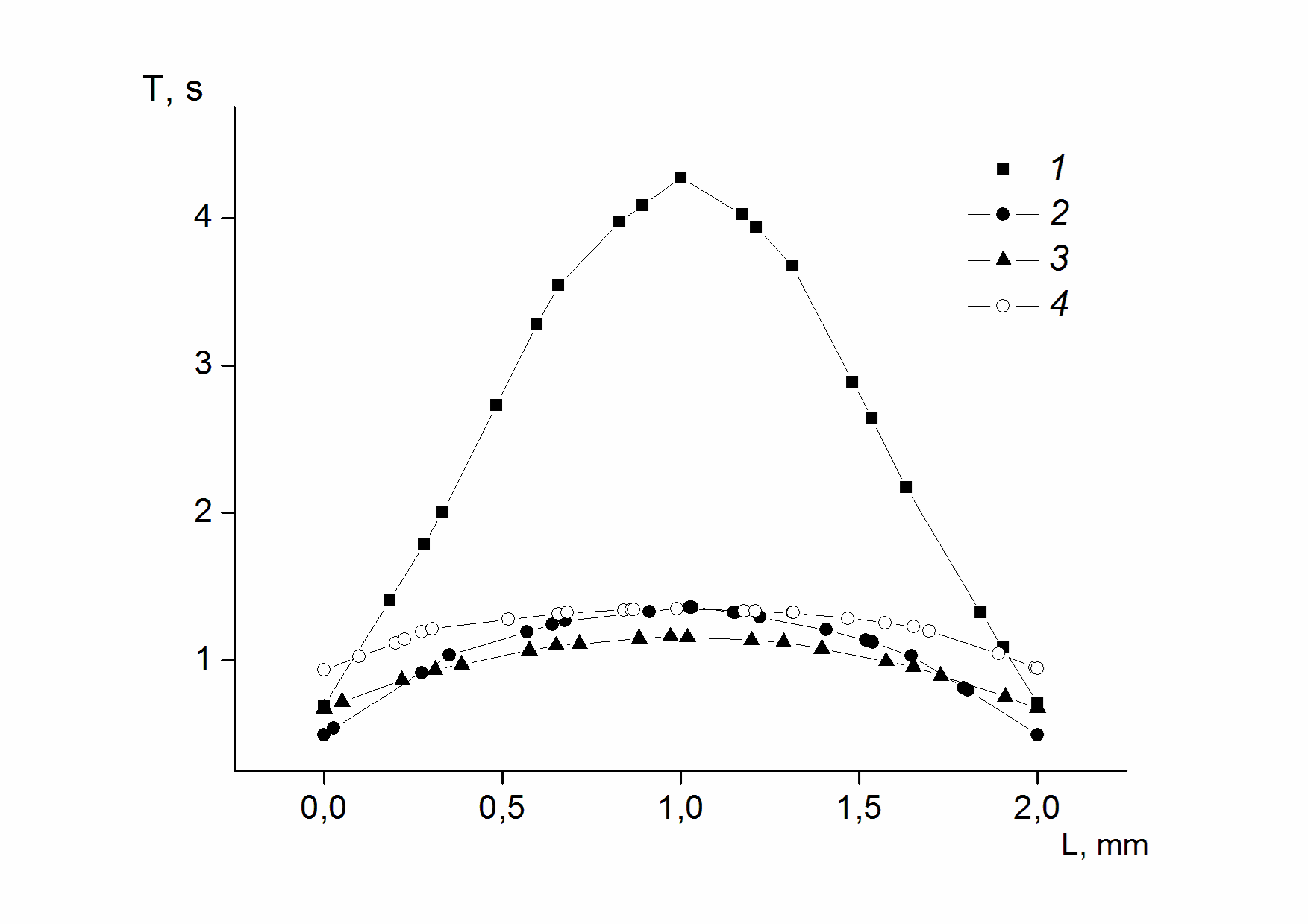 Рис. 13. Время охлаждения расплава полимера в сечении образца толщиной 2 мм (температура расплава 260°C; температуры формы 80°C) вблизи литника в зависимости от степени наполнения и вида наполнителя: 1 — ПА 6 + 20% Al2O3; 2 — ПА 6 + 40% Al2O3; 3 — ПА 6 + 60% Al2O3; 4 — ПА 6 + 40% Cu.